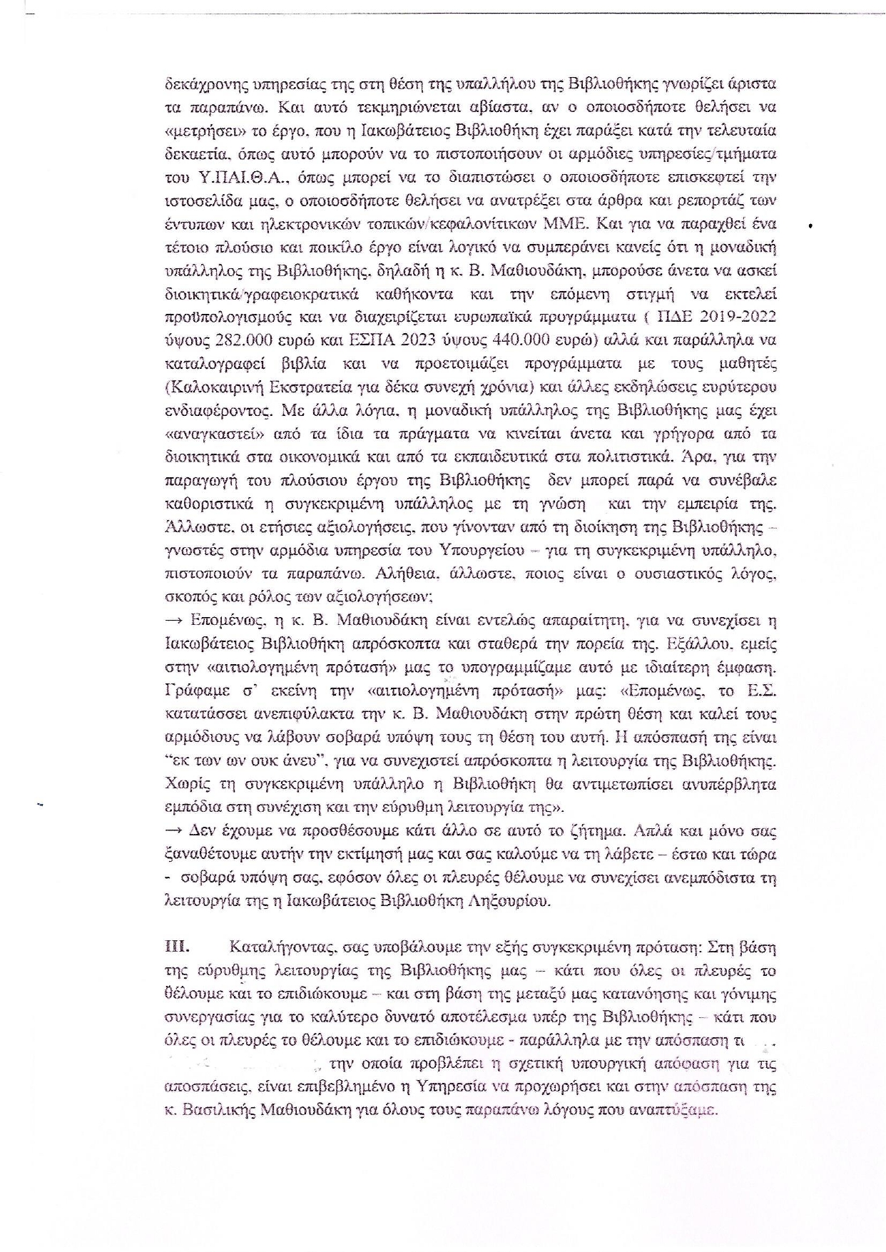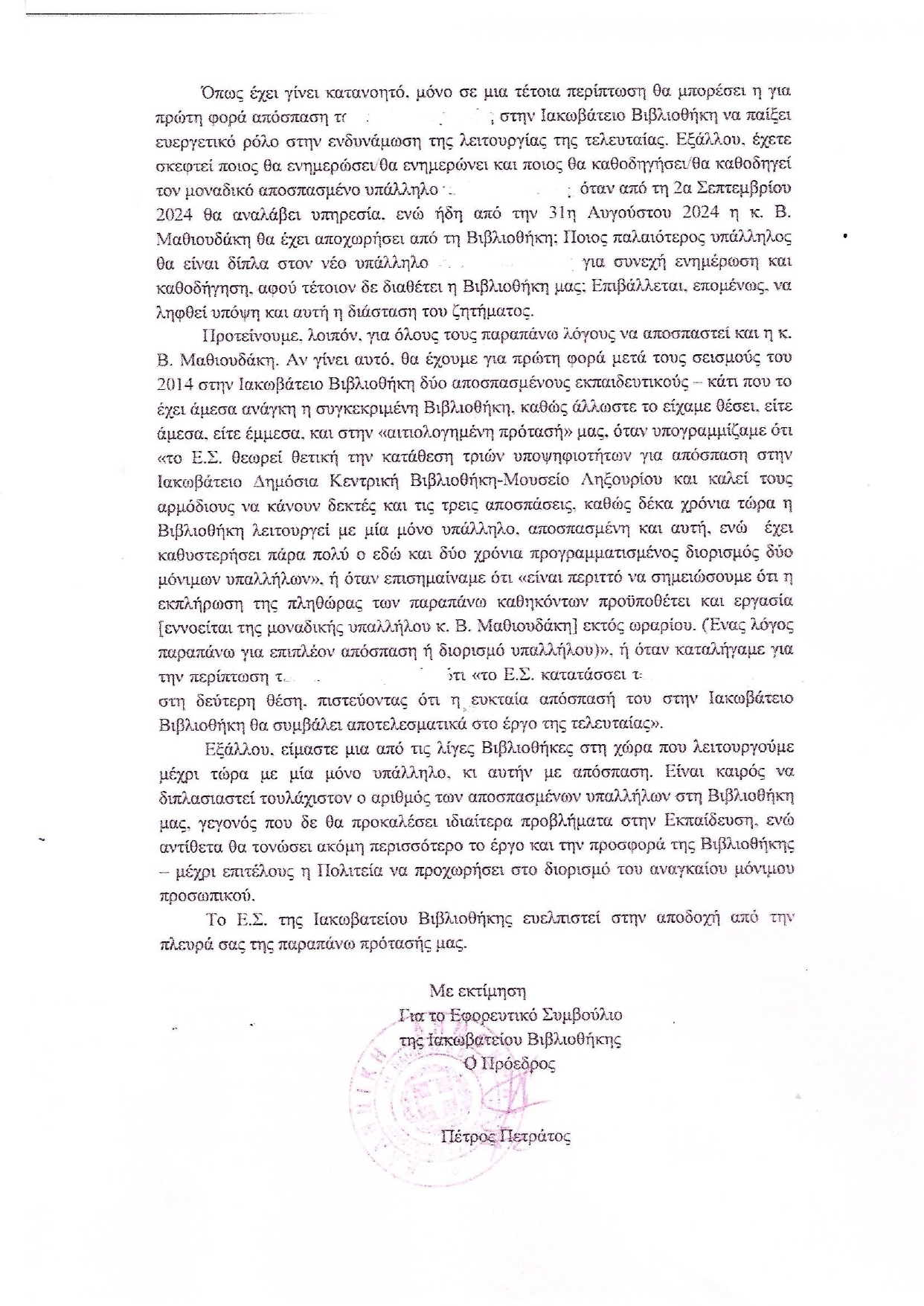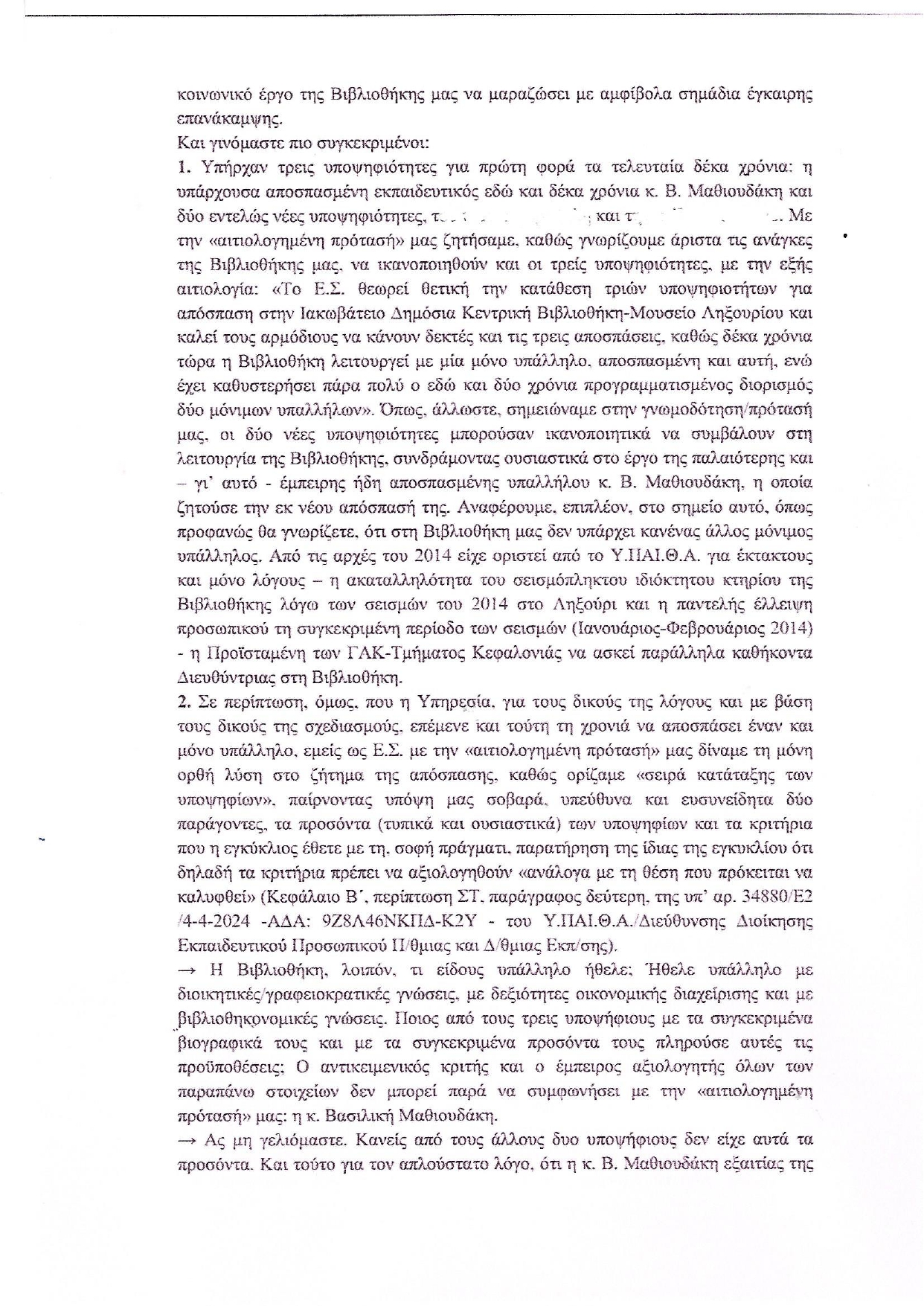 Σύμφωνα με την ισχύουσα νομοθεσία το Εφορευτικό Συμβούλιο γνωμοδοτεί για τις υποψηφιότητες, χωρίς ωστόσο να είναι η γνώμη του δεσμευτική για τον υπουργό Παιδείας, ο οποίος και έχει τον τελικό λόγο, καθώς υπογράφει τη σχετική απόφαση της απόσπασης. Εμείς, λοιπόν, ως Εφορευτικό Συμβούλιο διατυπώσαμε τη γνώμη μας-πρότασή μας, την οποία και επισυνάπτουμε για την ενημέρωση των συμπολιτών μας (ΚΕΙΜΕΝΟ 1). Η υπουργική, όμως, απόφαση με αρ. πρωτ. 61047/Γ4/4-6-2024 (η απόφαση δηλαδή για τις αποσπάσεις εκπαιδευτικών στην Εθνική Βιβλιοθήκη και σε όλες τις Δημόσιες Βιβλιοθήκες της χώρας) δεν έλαβε υπόψη της την πλήρως αιτιολογημένη γνωμοδότηση του Εφορευτικού Συμβουλίου, με αποτέλεσμα η υλοποίηση της συγκεκριμένης απόφασης να μην επιτρέπει από την 1η Σεπτεμβρίου του 2024 την κανονική/ουσιαστική λειτουργία της Βιβλιοθήκης μας. Και τούτο, επειδή δεν αποσπάστηκε η Β. Μαθιουδάκη, η οποία ήταν η μοναδική υποψήφια που ουσιαστικά διέθετε τα απαραίτητα προσόντα για τη συγκεκριμένη θέση. Μακάρι μαζί με αυτήν να είχαν αποσπαστεί και οι άλλοι δύο υποψήφιοι. Αλλά και ο ένας από αυτούς τους δύο που αποσπάστηκε, θα μπορούσε να λειτουργήσει προωθητικά για τη Βιβλιοθήκη μόνο αν ήταν η δεύτερη απόσπαση μετά από εκείνη της Β. Μαθιουδάκη.