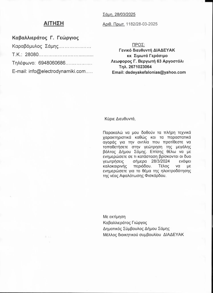 Υ/Γ 2 Στις 28/3/2024 στείλαμε επιστολή που ζητούσαμε ενημέρωση για την αντλία που θα έμπαινε στην γεώτρηση της Μεγάλης Βόλτας στην οποία επιστολή δεν πήραμε ποτέ απάντηση και στο συμβούλιο στις 8/4/2024 αναλύσαμε τους λόγους που η αντλία δεν θα «έβγαζε» καλοκαίρι δυστυχώς η επιβεβαίωση ήρθε ακόμη νωρίτερα στις 13/4/2025 η αντλία χάλασε.