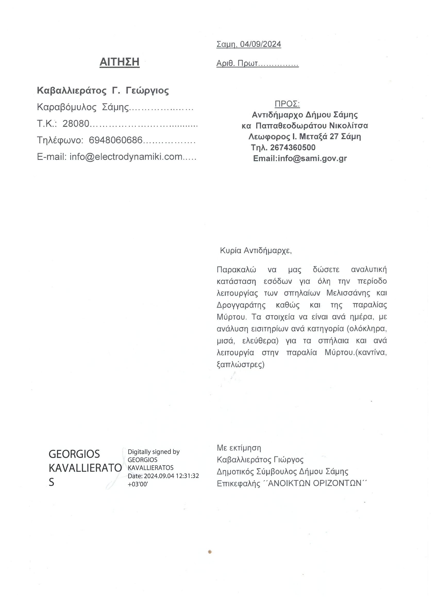 Και για να σοβαρευτούμε διότι  τα τεκταινόμενα  στον δήμο Σάμης προκαλούν κλαυσίγελο,  από τις 4 Σεπτεμβρίου  η παράταξη μας,  ως όφειλε, κατέθεσε Αίτηση προς την δημοτική αρχή ζητώντας στοιχεία για τα οικονομικά αποτελέσματα της παραλίας του Μύρτου και των σπηλαίων.