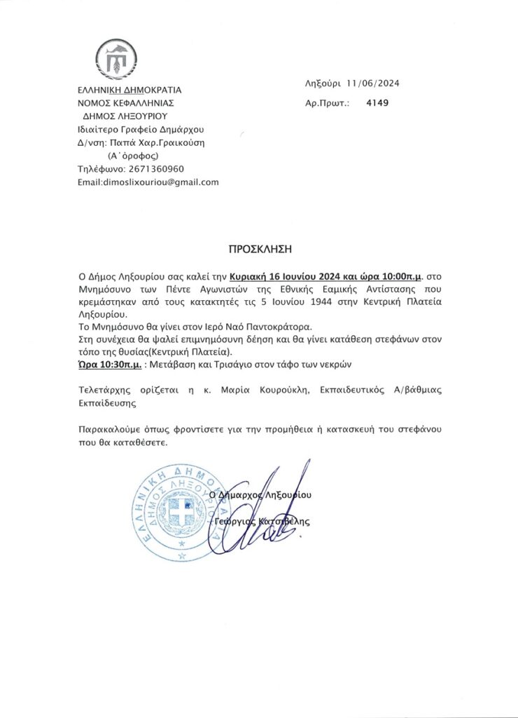 Δήμος Ληξουρίου: Την Κυριακή 16 Ιουνίου το Μνημόσυνο των Πέντε Αγωνιστών