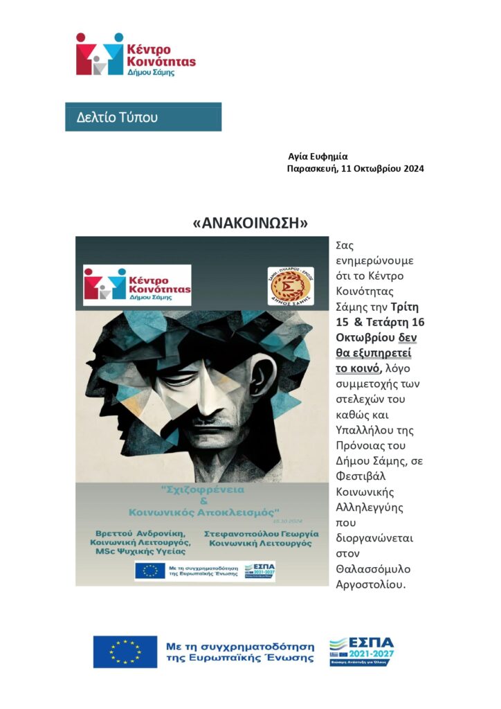Δεν θα εξυπηρετεί το κοινό το Κέντρο Κοινότητας Σάμης την Τρίτη 15 και Τετάρτη 16 Οκτωβρίου