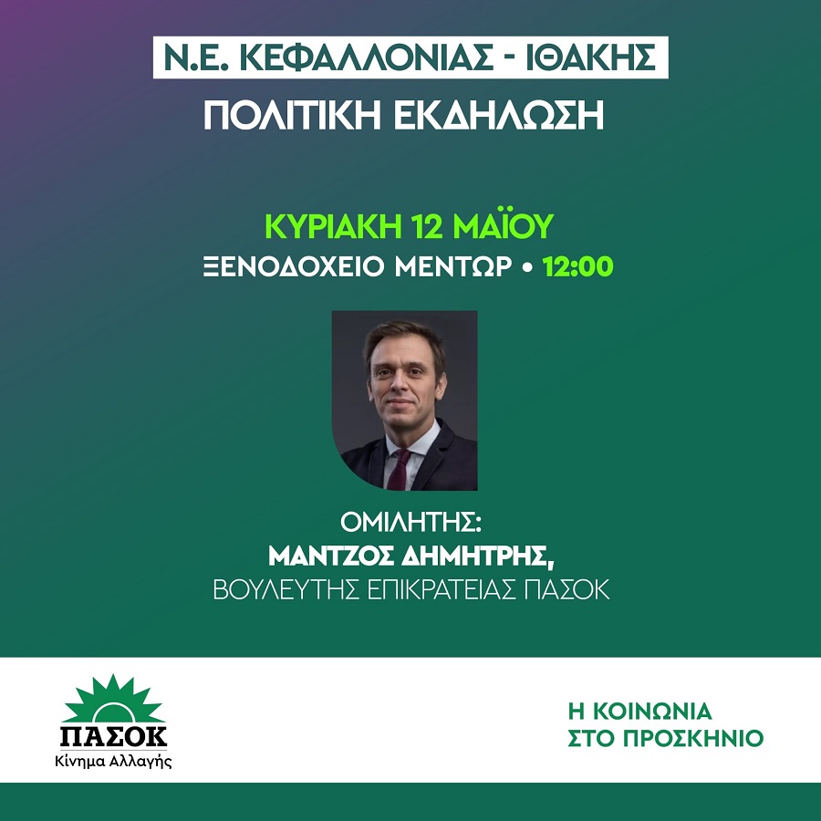 Η Νομαρχιακή Επιτροπή του ΠΑ.ΣΟ.Κ. Κεφαλονιάς και Ιθάκης και οι Τοπικές Οργανώσεις Αργοστολίου, Ληξουρίου, Σάμης και Ιθάκης καλούν τα μέλη και τους φίλους του Κινήματός μας σε πολιτικές εκδηλώσεις με ομιλητές: τον Βουλευτή Επικρατείας Δημήτρη Μάντζο και τους Υπ. Ευρωβουλευτές, Γιώργο Καλλιακμάνη, Γιάννη Πάζιο και Κατερίνα Ρίζου το Σάββατο 11 Μαΐου στις 18:00 στο Ληξούρι, στο Cozy Cafe και στις 20:30 στο Αργοστόλι, στην Αίθουσα του Εμπορικού Επιμελητηρίου.