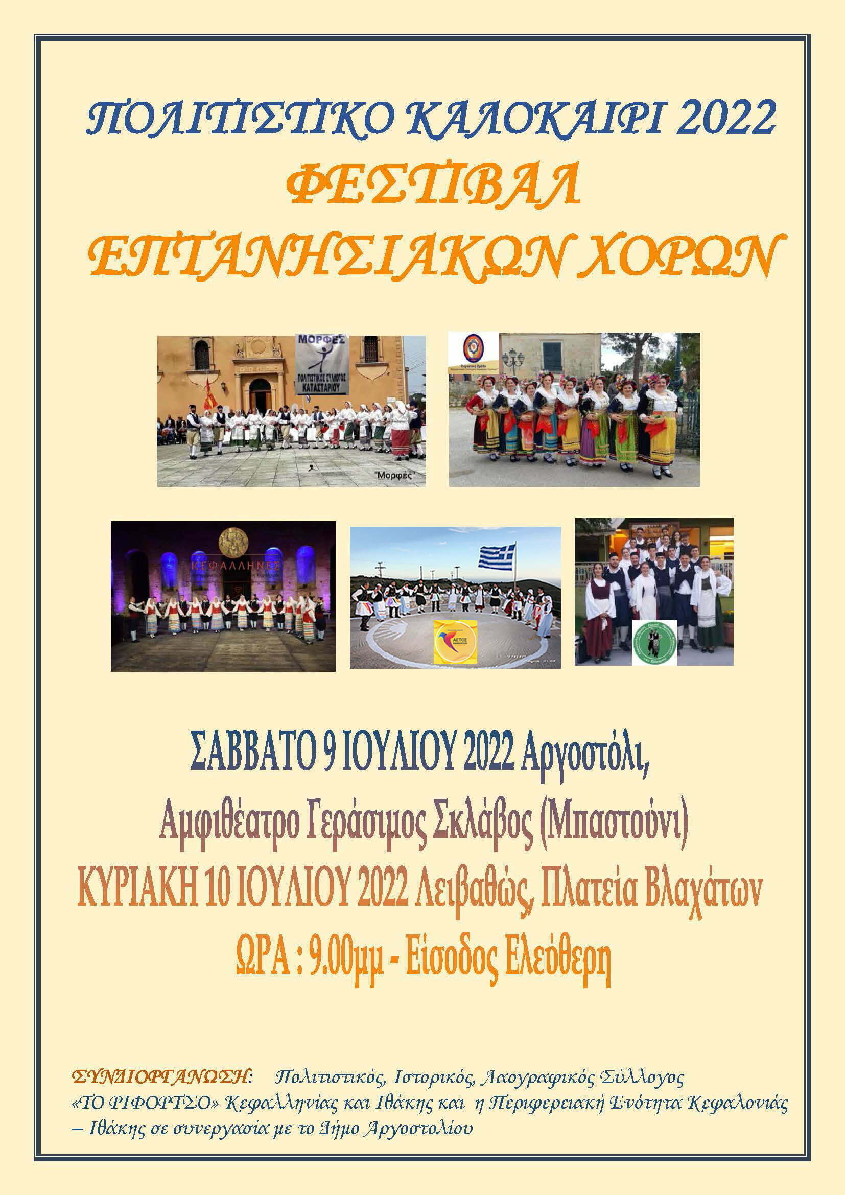 Το Σάββατο 9 Ιουλίου στο Αργοστόλι στις 21.00, στο Ανοιχτό θέατρο «Γεράσιμος Σκλάβος» στην προβλήτα κρουαζιερόπλοιων και την Κυριακή 10 Ιουλίου στις 21.00 στην πλατεία Βλαχάτων, χορευτικοί σύλλογοι από Κέρκυρα, Ζάκυνθο και Κεφαλονιά θα παρουσιάσουν Επτανησιακούς χορούς.