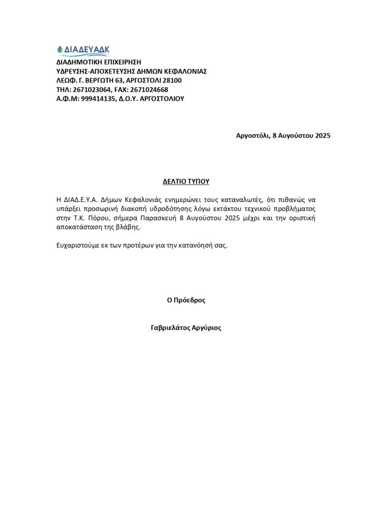 Διακοπή υδροδότησης στον Πόρο σήμερα Παρασκευή 8 Αυγούστου