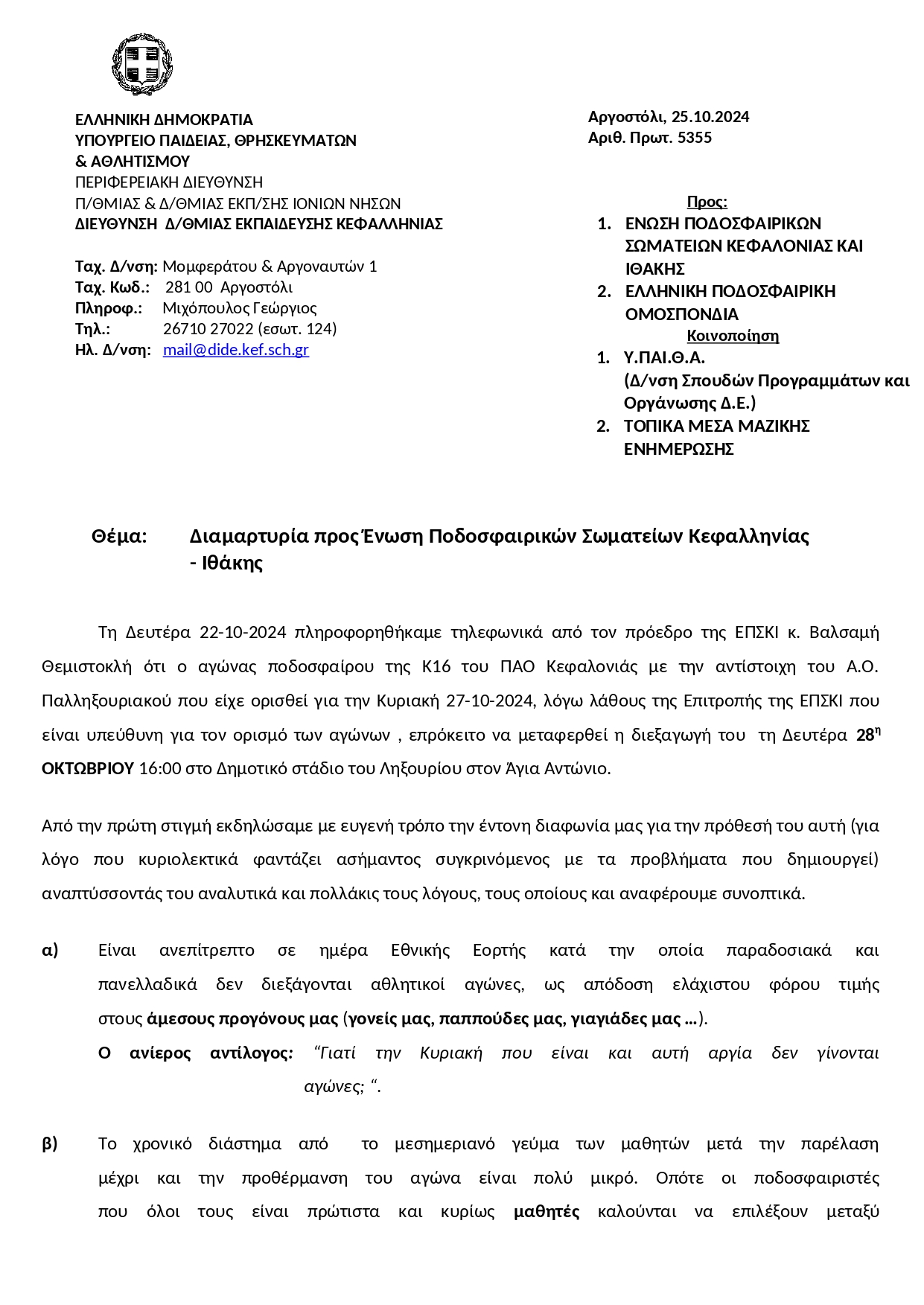 Διαμαρτυρία προς Ένωση Ποδοσφαιρικών Σωματείων Κεφαλληνίας- Ιθάκης