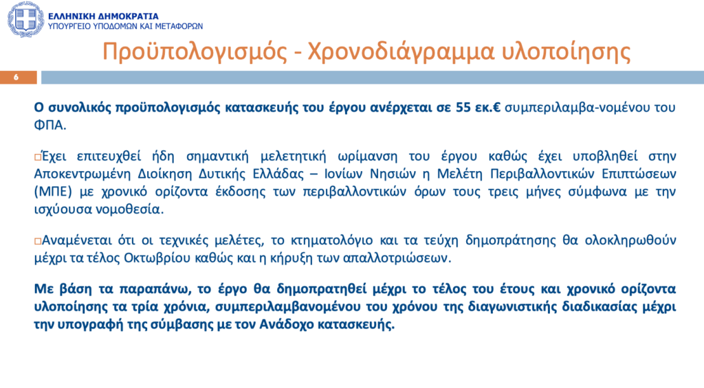 Το χρονοδιάγραμμα υλοποίησης που είχε δοθεί την ίδια ημέρα στη δημοσιότητα από το Υπουργείο Υποδομών και Μεταφορών, προέβλεπε τη δημοπράτηση του έργου έως το τέλος του 2022 και χρονικό ορίζοντα υλοποίησης του τα 3 χρόνια, συμπεριλαμβανομένου του χρόνου της διαγνωστικής διαδικασίας μέχρι την υπογραφή της σύμβασης με τον Ανάδοχο της κατασκευής.