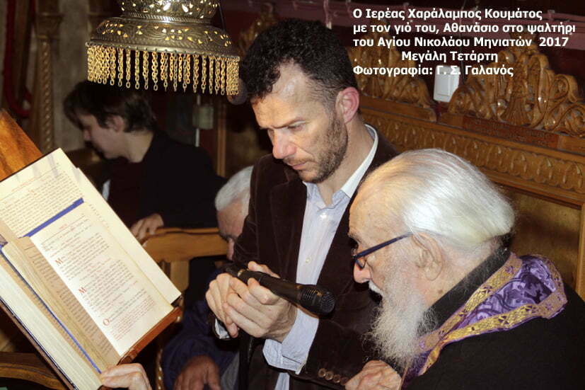 Υπηρέτησε τόσο το ψαλτήρι όσο και την ιεροσύνη με σεβασμό και ευλάβεια προς το Θείο. Μαζί με τον δίδυμο μακαριστό αδελφό του Κωνσταντίνο έχοντας την πατρική διδαχή και παρακαταθήκη του ιερέα Γεράσιμου Κουμάτου, ύψωσαν το σκοπό όπου τάχτηκαν σε λειτούργημα ψυχής και κοινωνικότητας, αφήνοντάς μας, άριστες εικόνες και επικοινωνίες που υπογράφονταν προσεγμένα κάθε φορά, από το « Άνω σχώμεν τα καρδίας».