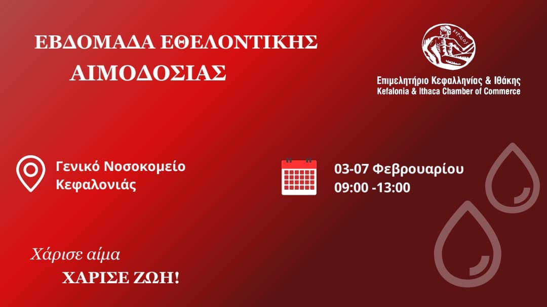 Το Επιμελητήριο Κεφαλληνίας και Ιθάκης σε προσκαλεί να συμμετάσχεις σε μια πράξη αγάπης και αλληλεγγύης! Από τις 3-7 Φεβρουαρίου και ώρες από 09:00-13:00 διοργανώνουμε την Εβδομάδα Εθελοντικής Αιμοδοσίας, προσφέροντας την ευκαιρία σε όλους να γίνουν μέρος μιας πρωτοβουλίας που σώζει ζωές.