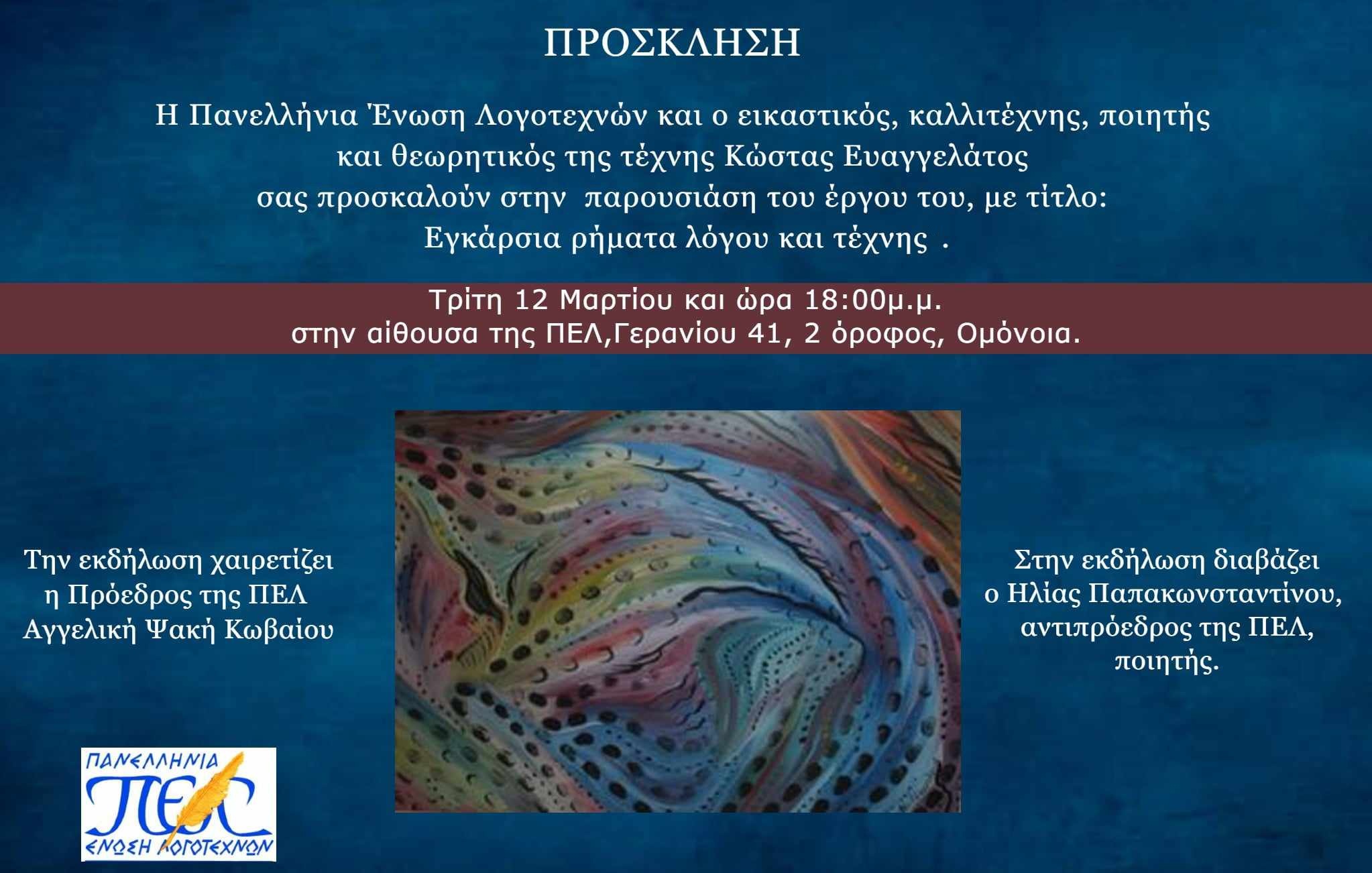 ΕΓΚΑΡΣΙΑ ΡΗΜΑΤΑ ΛΟΓΟΥ ΚΑΙ ΤΕΧΝΗΣ ΤΟΥ ΚΩΣΤΑ ΕΥΑΓΓΕΛΑΤΟΥ / ΤΙΜΗΤΙΚΗ ΠΑΡΟΥΣΙΑΣΗ ΣΤΗΝ ΠΑΝΕΛΛΗΝΙΑ ΕΝΩΣΗ ΛΟΓΟΤΕΧΝΩΝ.