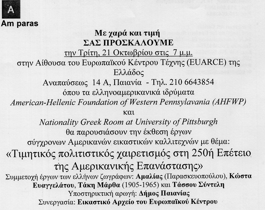 Στις 21 Οκτωβρίου, ώρα 7 μ.μ. θα εκτεθούν ζωγραφικά έργα του (Bodygraphics- Σωματογραφίες) από την μόνιμη συλλογή- αρχείο του Ευρωπαικού Κέντρου Τέχνης (EUARCE) της Ελλάδος (Αναπαύσεως 14Α, Παιανία, Αττικής.) στα πλαίσια της επετειακής εκδήλωσης και της εικαστικής έκθεσης διεθνών καλλιτεχνών με τίτλο: «Τιμητικός χαιρετισμός στη 250η Επέτειο της Αμερικανικής Επανάστασης»