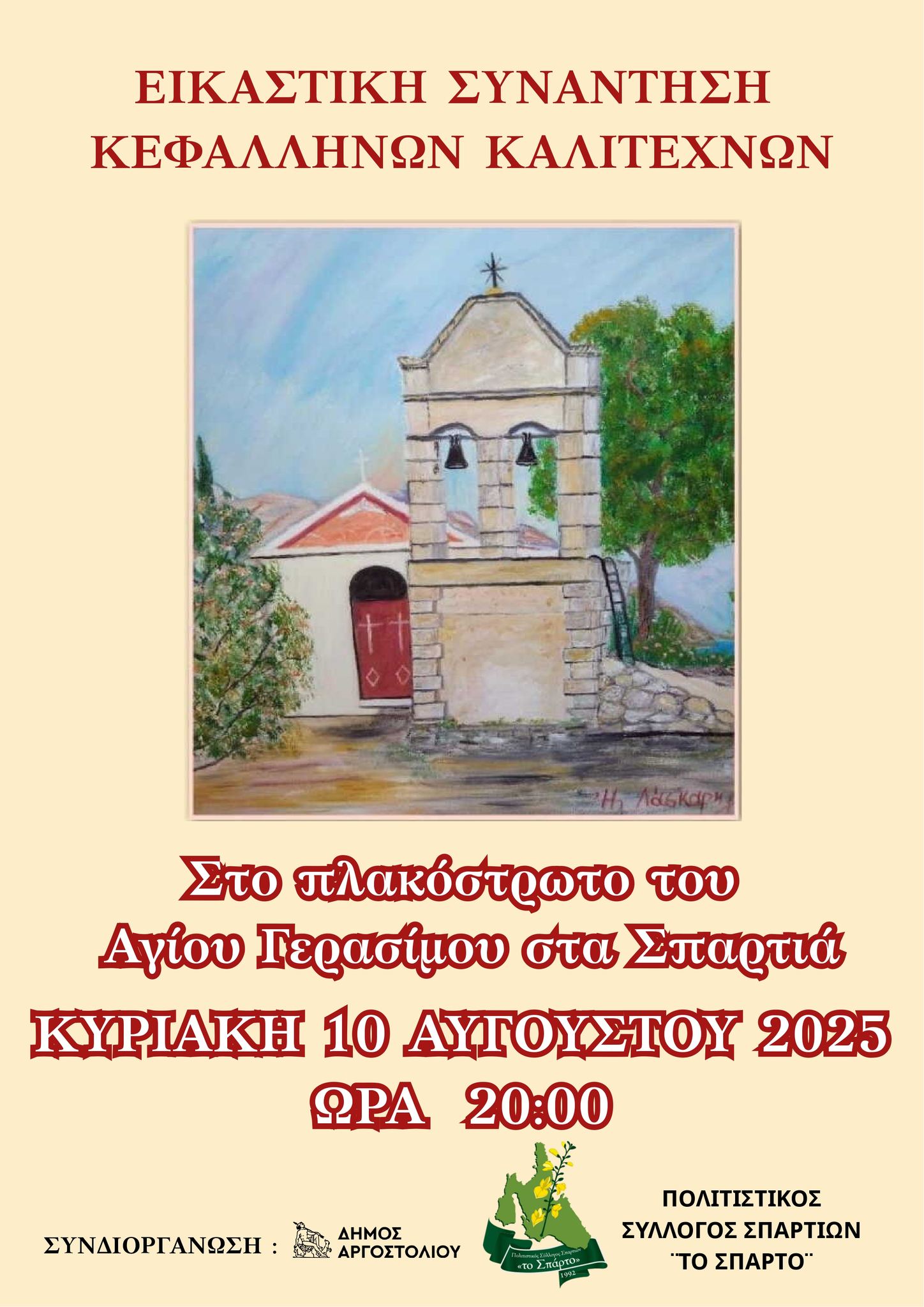 ΛΕΙΒΑΘΩ, ΣΠΑΡΤΙΑ, ώρα: 20.00, στο πλακόστρωτο του Αγίου Γερασίμου, στο δρόμο με τα ερείπια του προσεισμικού χωριού των Σπαρτιών, διοργανώνεται η 5η Έκθεση Εικαστικής Δημιουργίας Κεφαλλήνων Καλλιτεχνών.