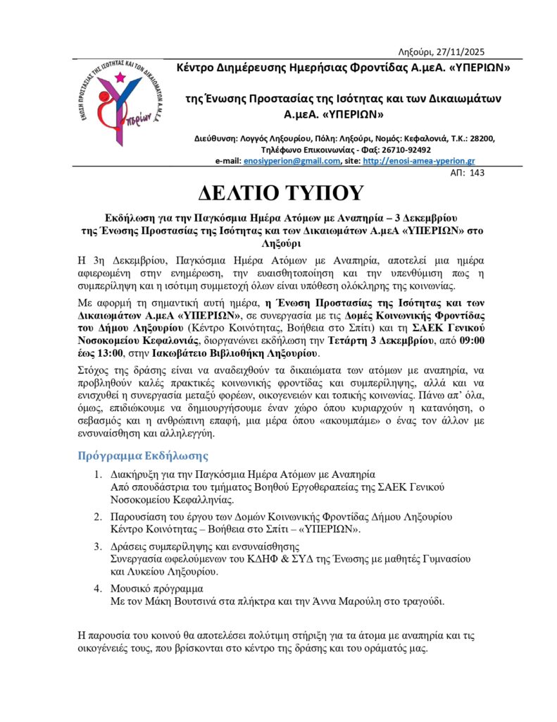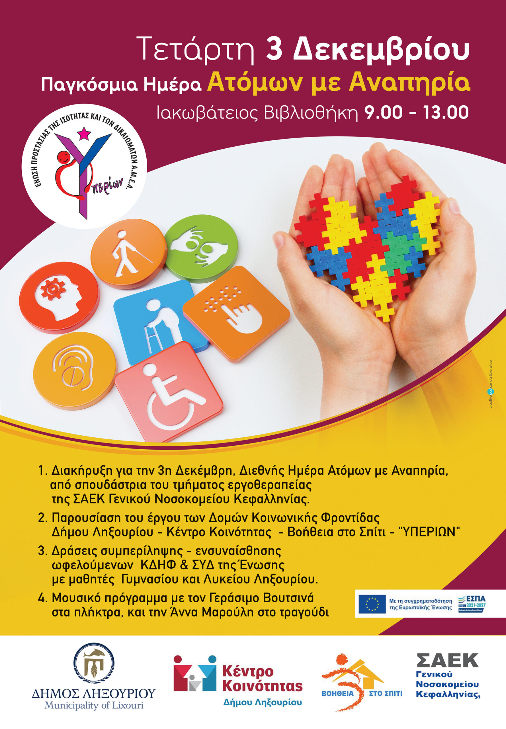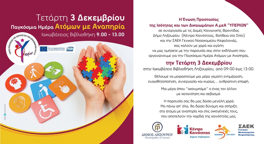 Εκδήλωση για την Παγκόσμια Ημέρα Ατόμων με Αναπηρία – 3 Δεκεμβρίου της Ένωσης Προστασίας της Ισότητας και των Δικαιωμάτων Α.μεΑ «ΥΠΕΡΙΩΝ» στο Ληξούρι