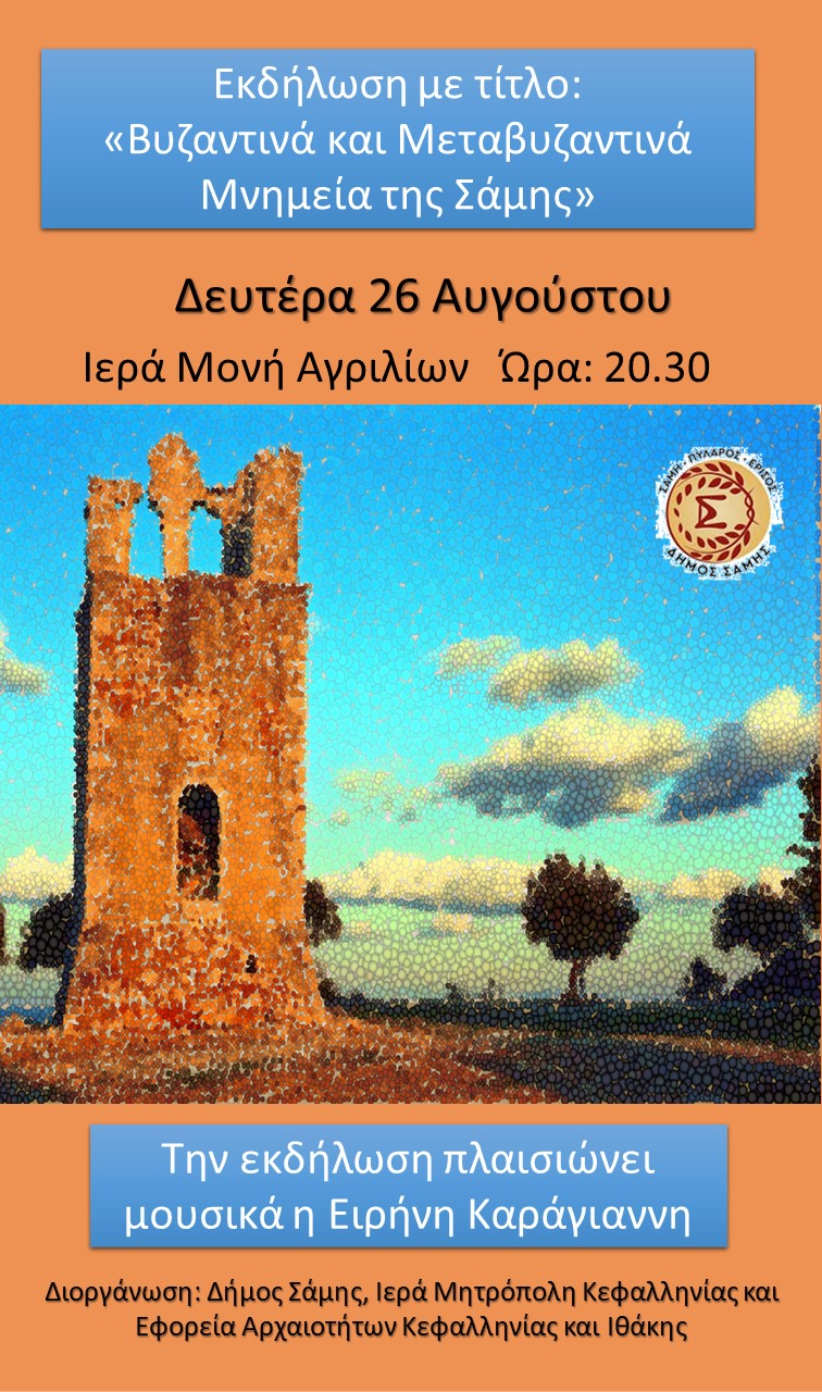Εκδήλωση που διοργανώνει ο Δήμος Σάμης σε συνεργασία με την Ιερά Μητρόπολη Κεφαλληνίας και την Εφορεία Αρχαιοτήτων Κεφαλληνίας και Ιθάκης τη Δευτέρα 26 Αυγούστου στην Ιερά Μονή Αγριλίων στις 20.30.