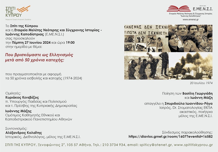 Το “Σπίτι της Κύπρου” της Πρεσβείας της Κυπριακής Δημοκρατίας στην Αθήνα και η “Εταιρεία Μελέτης Νεότερης & Σύγχρονης Ιστορίας – Ιωάννης Καποδίστριας” (Ε.ΜΕ.Ν.Σ.Ι.) σας προσκαλούν την Πέμπτη 27 Ιουνίου 2024 και ώρα 19:00 στην ημερίδα με θέμα: