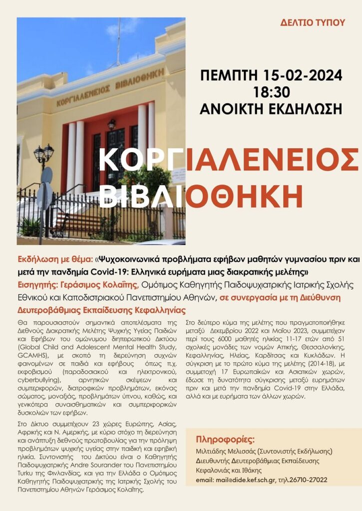 Εκδήλωση στην Κοργιαλένειο με θέμα «Ψυχοκοινωνικά προβλήματα εφήβων μαθητών γυμνασίου πριν και μετά την πανδημία Covid-19: Ελληνικά ευρήματα μιας διακρατικής μελέτης»