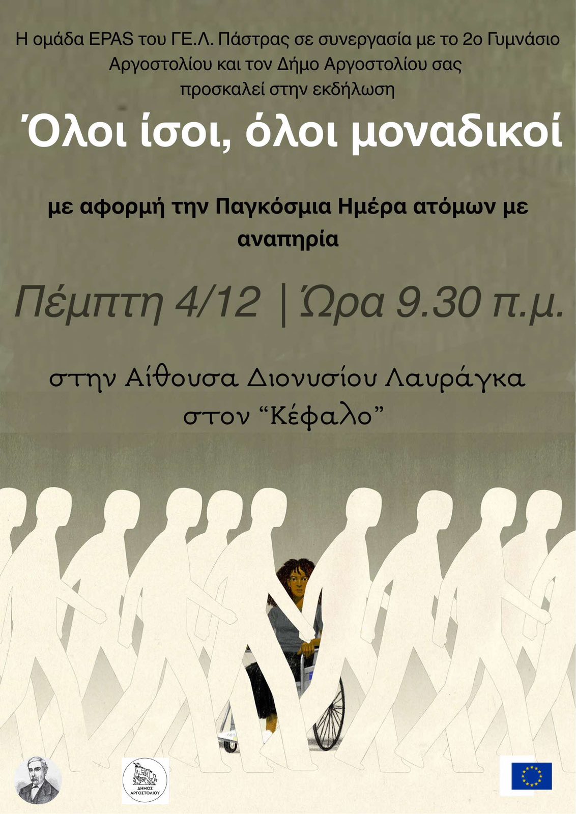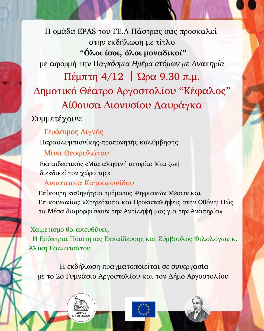 Σε συνέχεια της συνεργασίας της ομάδας EPAS των μαθητών του Γενικού Λυκείου Πάστρας, του 2ου Γυμνασίου Αργοστολίου “Ιωσήφ Μομφεράτος” και του Δήμου Αργοστολίου και με αφορμή την Παγκόσμια Ημέρα Αναπηρίας, θα πραγματοποιηθεί την Πέμπτη 4 Δεκεμβρίου και ώρα 9:30 π.μ., η εκδήλωση με τίτλο «Όλοι Ίσοι, όλοι μοναδικοί», με στόχο την προώθηση της ισότητας, του σεβασμού και της συμπερίληψης.