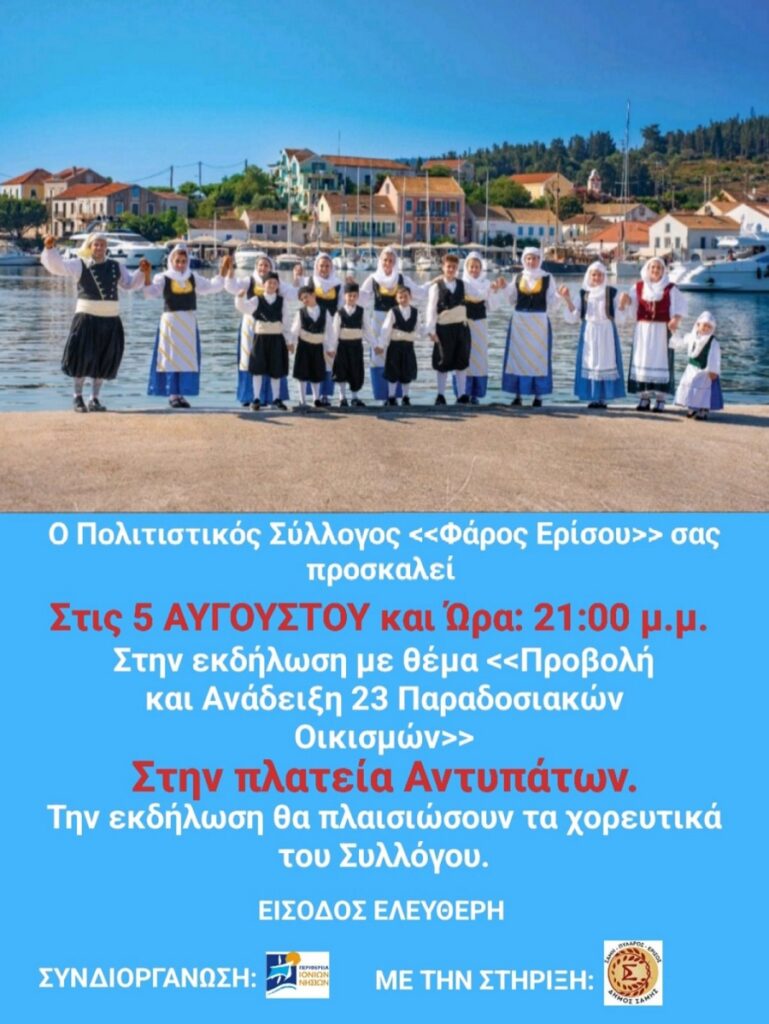 Σήμερα το βράδυ στις 21.00 θα πραγματοποιηθεί εκδήλωση με θέμα “Προβολή και ανάδειξη 23 παραδοσιακών οικισμών της Ερίσου” στην πλατεία των Αντιπάτων. Παράλληλα, θα γίνει παρουσίαση από τα χορευτικά τμήματα του συλλόγου “Φάρος”. Διοργάνωση: Πολιτιστικός Σύλλογος Ερίσου “Φάρος”.