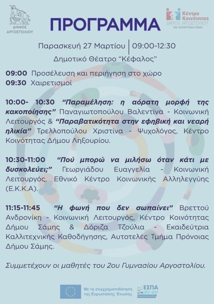Η δράση θα πραγματοποιηθεί την Παρασκευή 27 Μαρτίου, στο Δημοτικό Θέατρο «Ο Κέφαλος» στο Αργοστόλι, και απευθύνεται σε μαθητές και μαθήτριες της Γ΄ τάξης των Γυμνασίων του Δήμου.