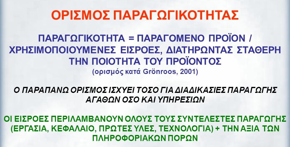 Στην Οικονομική επιστήμη ο όρος παραγωγικότητα χαρακτηρίζ ει το μέτρο της παραγωγικής ικανότητας, το οποίο και εκφράζεται κατ΄ αναλογία του είδους και του ύψους της παραγωγής σε σχέση με τους παραγωγικούς συντελεστές που απαιτούνται γι΄ αυτήν.