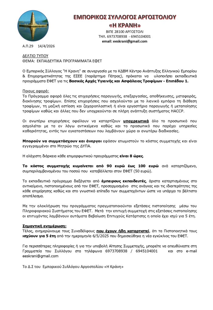 Εμπορικός Σύλλογος Η Κράνη: Εκπαιδευτικά προγράμματα ΕΦΕΤ