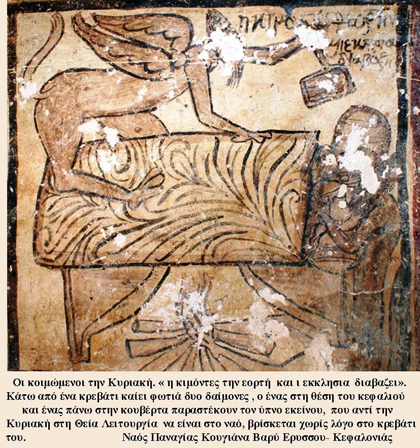 4. Οι κοιμώμενοι την Κυριακή. « η κιμόντες την εορτή και ι εκκλησια διαβαζει». Κάτω από ένα κρεβάτι καίει φωτιά δυο δαίμονες , ο ένας στη θέση του κεφαλιού και ένας πάνω στην κουβέρτα παραστέκουν τον ύπνο εκείνου, που αντί την Κυριακή στη Θεία Λειτουργία να είναι στο ναό, βρίσκεται χωρίς λόγο στο κρεβάτι του.