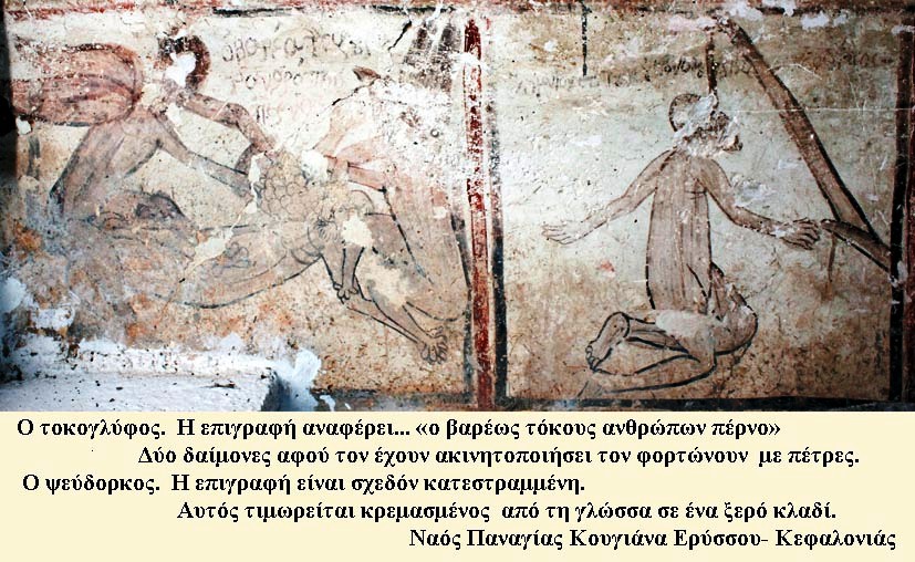 1. Ο τοκογλύφος. Η επιγραφή αναφέρει… «ο βαρέως τόκους ανθρώπων πέρνο» Δύο δαίμονες αφού τον έχουν ακινητοποιήσει τον φορτώνουν με πέτρες.