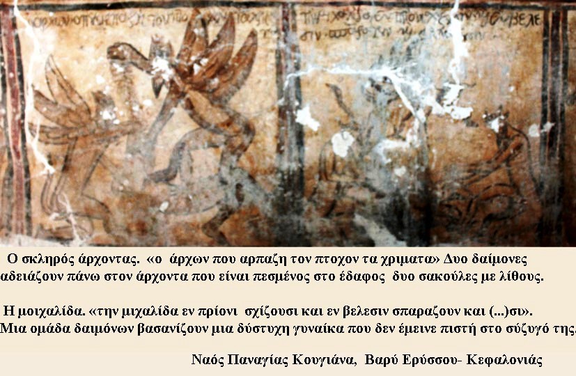 6. Η μοιχαλίδα. «την μιχαλίδα εν πρίονι σχίζουσι και εν βελεσιν σπαραζουν και (…)σι». Μια ομάδα δαιμόνων βασανίζουν μια δύστυχη γυναίκα που δεν έμεινε πιστή στο σύζυγό της.