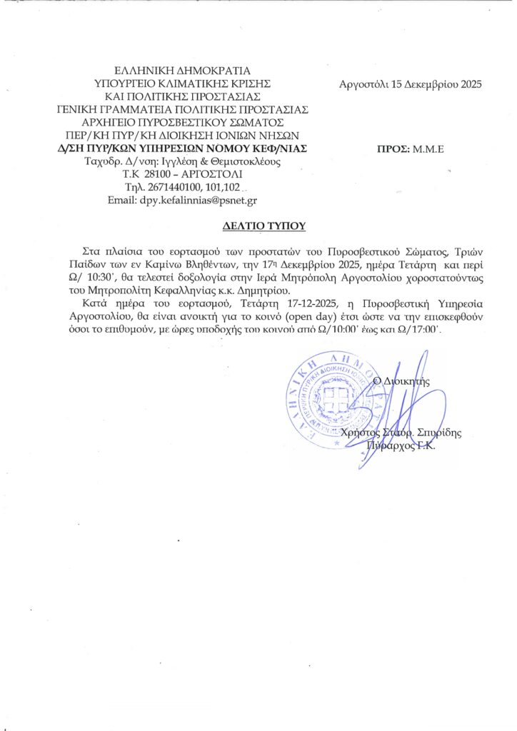 Εορτασμός Προστατών Πυροσβεστικού Σώματος Τριών Παίδων εν Καμίνω Βληθέντων
