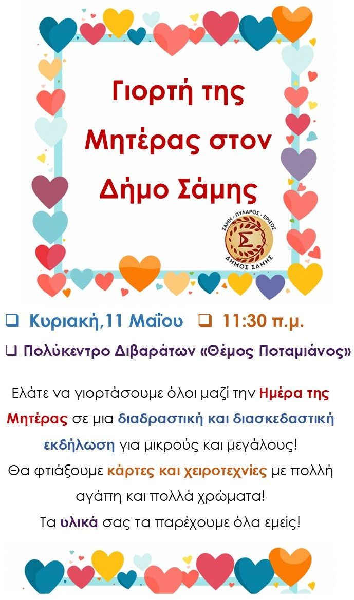 Την Κυριακή, 11 Μαΐου 2025 ο Δήμος Σάμης σας προσκαλεί να γιορτάσουμε την Παγκόσμια Ημέρα της Μητέρας στον χώρο του Πολύκεντρου Διβαράτων «Θέμος Ποταμιάνος» στις 11:30 το πρωί.