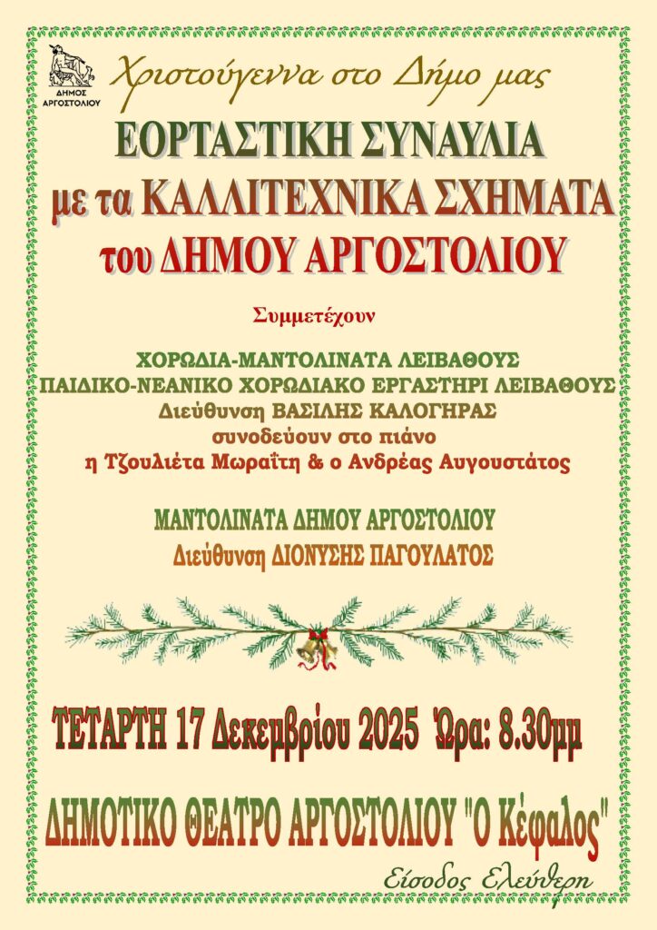 Εορταστική Συναυλία με τα Καλλιτεχνικά Σχήματα του Δήμου Αργοστολίου την Τετάρτη 17 Δεκεμβρίου