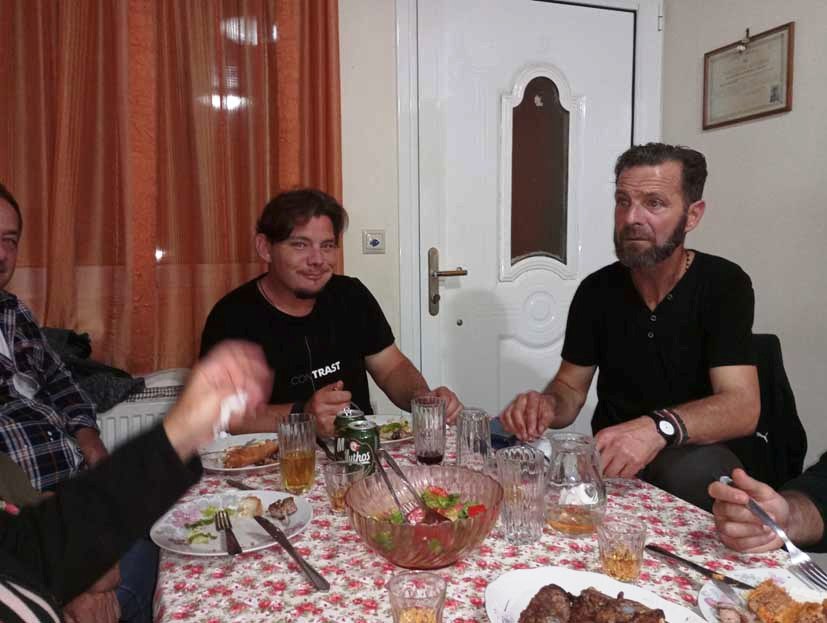Μελετώντας την εικόνα, είχε τελείωση και ο εσπερινός και άκουσα τον Μάκη τον Ξένο… έλα στο σπίτι μου, έχει φιλόξενο ζεύκι. Καθίσαμε γύρω στα 15 άτομα σε τραπέζι μακρόστενο, στο σπίτι του Παναγή Ξένου. Φαγητά, ψητά και φτιαχτά, περίσσια και νόστιμα, τυριά και σαλάτα, γλυκό εξαιρετικό, όλα καλά και όμορφα με πρώτο το κρασί, που ήταν ένας τύπος.. κεχριμπαρένιο θηνιάτικο «οινοκονιάκι». Άπλωσα το χέρι μου και γιόμισα το ποτήρι μου, αρκετές φορές, μα είχα τα μέντε μου, γιατί ξέρω πως το κράσινο οινό-πνευμα μπατάρει το άλλο πνεύμα. Πάνω στο κέφι ειπώθηκαν παλιά και νέα πράγματα, παλιές ιστορίες, χιουμοριστικά, πειράγματα καλοσυνάτα έως που ήρθε στα χείλη μας το τραγούδι και τα συμπλήρωσε όλα τόσο όμορφα.