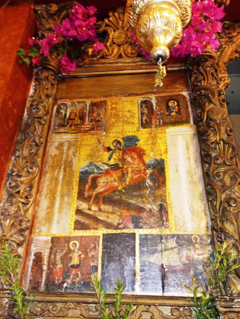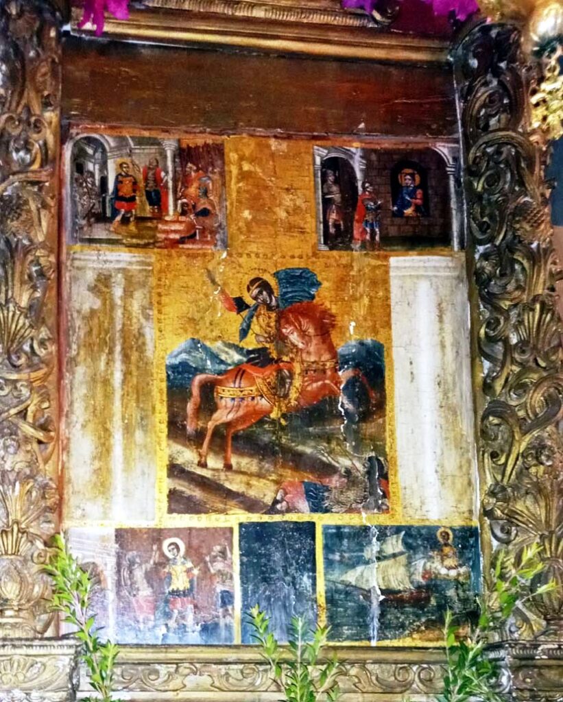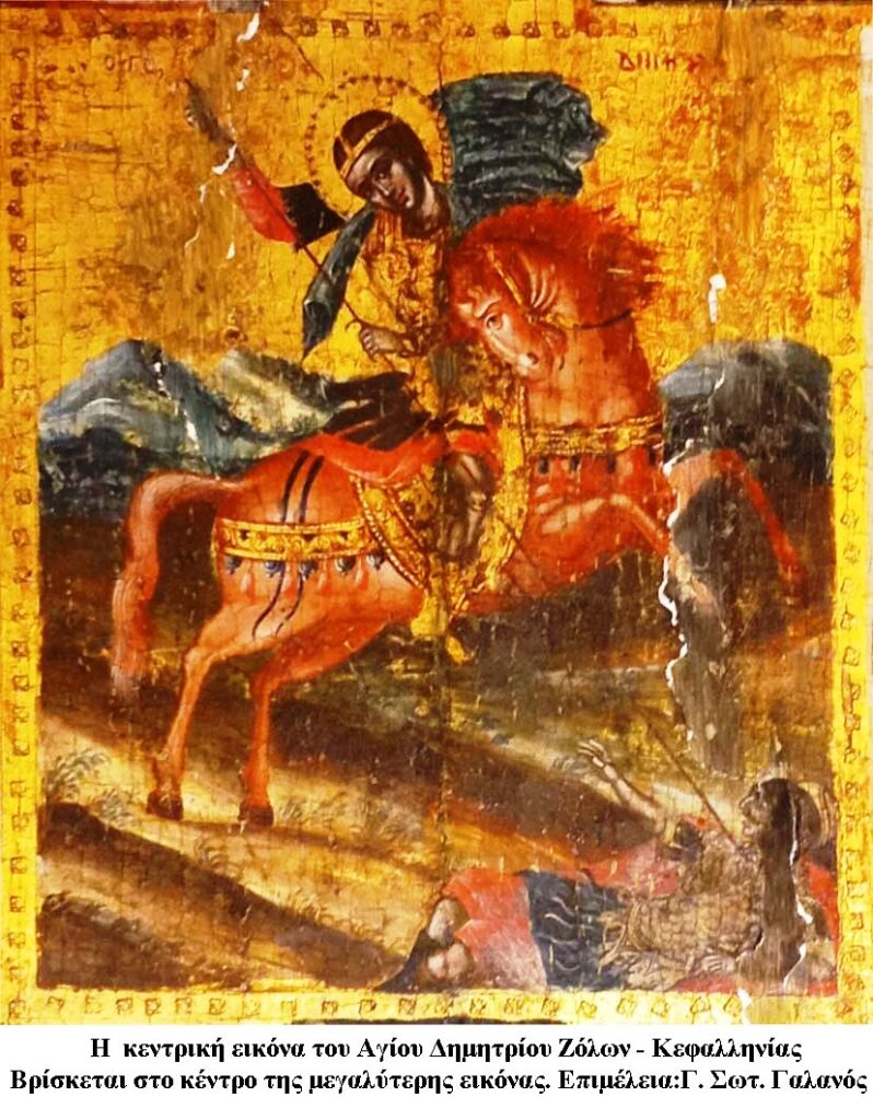 Μια υπέροχη εικόνα είναι αυτή, του αγίου Δημητρίου, τοποθετημένη στο εικονοστάσι του ναού, δηλαδή στο τέμπλο, που, ως ξυλόγλυπτο έργο, θυμίζει την παλιά επτανησιακή τέχνη, που άντεξε έως σήμερα από σεισμούς και από διάφορες καταστροφές.