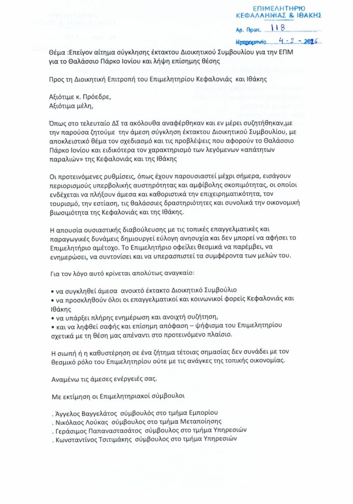 Κρίνουμε ότι είναι επιτακτική ανάγκη να συγκληθεί άμεσα έκτακτο, ανοικτό διοικητικό συμβούλιο του Επιμελητηρίου Κεφαλονιάς και Ιθάκης, με αποκλειστικό θέμα την ΕΜΠ για το Θαλάσσιο Πάρκο του Ιονίου, και προχωρήσαμε σε γραπτό αίτημα για τη σύγκλησή του.