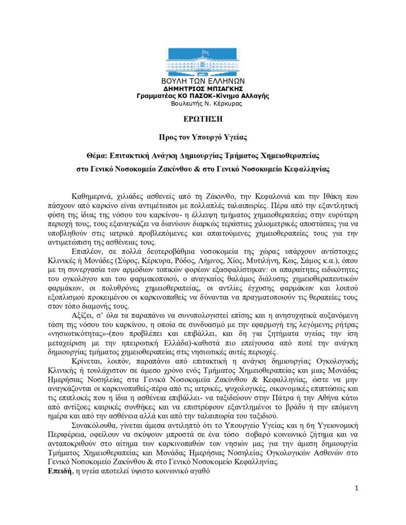 Κατατέθηκε χθες στη Βουλή των Ελλήνων, η υπ’ αριθμ. 7129/27-6-2025 Ερώτηση του Δημητρίου Μπιάγκη, Γραμματέα της Κοινοβουλευτικής Ομάδας του ΠΑ.ΣΟ.Κ. – Κινήματος Αλλαγής & Βουλευτή Κέρκυρας, την οποία συνυπογράφουν οι Βουλευτές: Παύλος Γερουλάνος (Α’ Αθηνών), Δημήτρης Μάντζος (Επικρατείας) και Ιωάννης Τσίμαρης (Ιωαννίνων) προς τον Υπουργό Υγείας με θέμα την ανάγκη να δημιουργηθεί Τμήμα Χημειοθεραπείας στο Γενικό Νοσοκομείο Ζακύνθου και στο Γενικό Νοσοκομείο Κεφαλληνίας.
