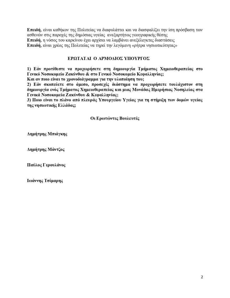 Ερωτάται δε ο αρμόδιος Υπουργός Υγείας εάν προτίθεται να προχωρήσει στη δημιουργία Τμήματος Χημειοθεραπείας στο Γενικό Νοσοκομείο Ζακύνθου και στο Γενικό Νοσοκομείο Κεφαλληνίας και ποιο είναι το χρονοδιάγραμμα για την υλοποίηση του. Εάν σκοπεύει στο άμεσο, προσεχές διάστημα να προχωρήσει τουλάχιστον στη δημιουργία ενός Τμήματος Χημειοθεραπείας και μιας Μονάδας Ημερήσιας Νοσηλείας στα Γενικά Νοσοκομεία Ζακύνθου και Κεφαλληνίας και ποιο είναι το πλάνο από πλευράς Υπουργείου Υγείας για τη στήριξη των δομών υγείας της νησιωτικής Ελλάδας.