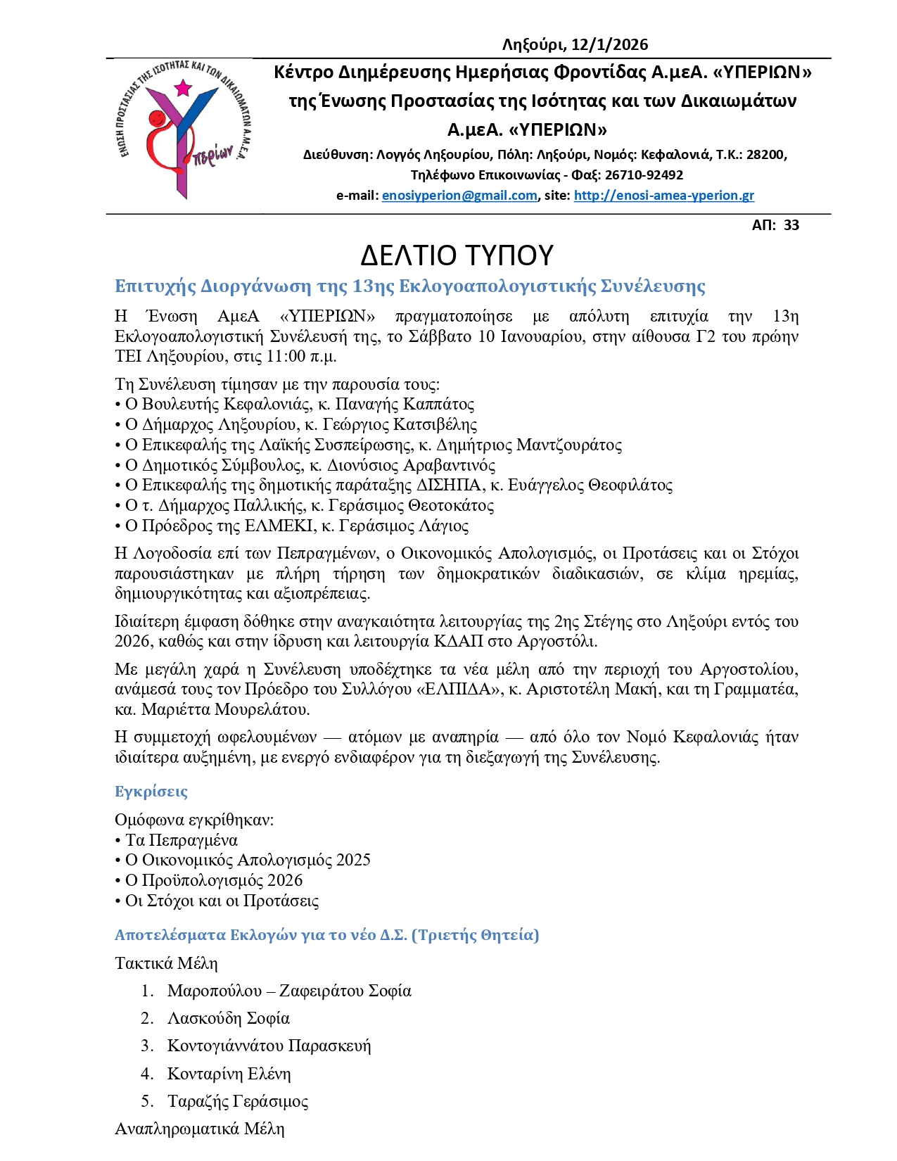 Επιτυχής Διοργάνωση της 13ης Εκλογοαπολογιστικής Συνέλευσης
