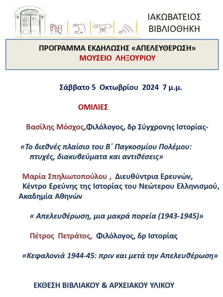 Η Ιακωβάτειος Βιβλιοθήκη, με τη συμπλήρωση 80 χρόνων από την απελευθέρωση της χώρας, όπως και της Κεφαλονιάς, από τους Γερμανούς το 1944, σας προσκαλεί στην Εσπερίδα που διοργανώνει το Σάββατο, 5 Οκτωβρίου 2024, στις 7 μ.μ., στην κεντρική αίθουσα του Μουσείου Ληξουρίου με σχετικές ομιλίες και Έκθεση βιβλιακού και αρχειακού υλικού από τα βιβλία και τα αρχειακά τεκμήρια της Βιβλιοθήκης μας.