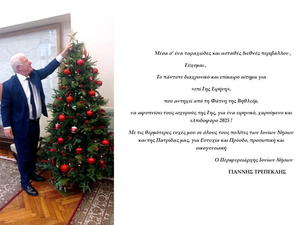 Ευχές Περιφερειάρχη Ιονίων Νήσων για τα Χριστούγεννα και το Νέο Έτος 2025!