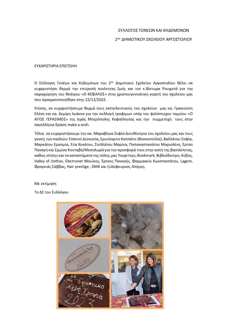 Ευχαριστήρια επιστολή από το Σύλλογο Γονέων και Κηδεμόνων 2ου Δημοτικού Αργοστολίου