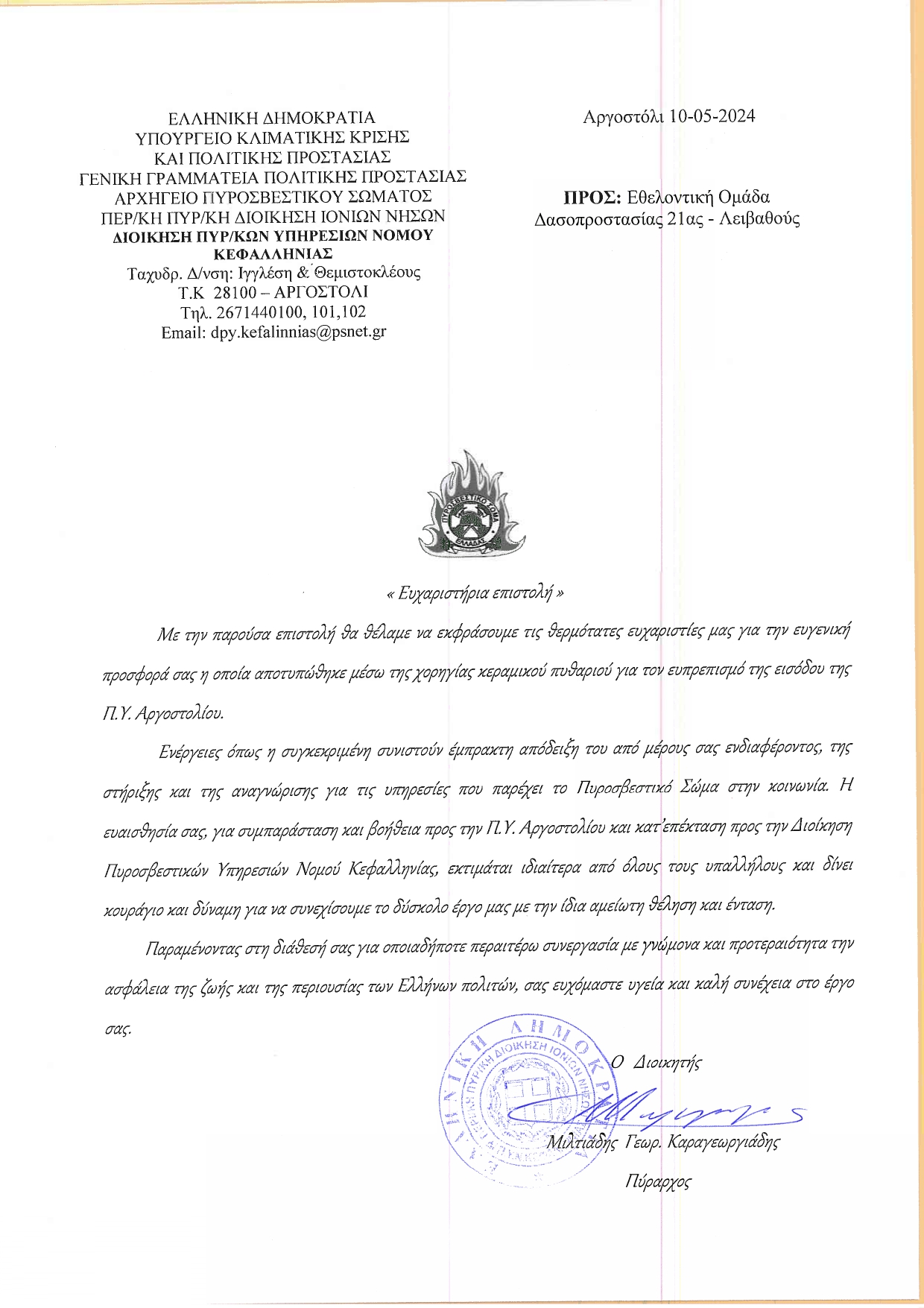Ευχαριστήρια επιστολή της Πυροσβεστικής Υπηρεσίας προς την Εθελοντική Ομάδα Δασοπροστασίας 21ας Λειβαθούς