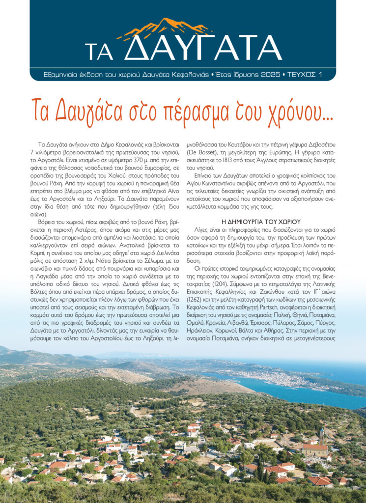 Με τον τρόπο του και τις δυνατότητές του, ο καθένας μας θα αφήσει ένα αποτύπωμα στην μακραίωνη ιστορία των Δαυγάτων Κεφαλληνίας. Μια παρακαταθήκη σε αυτούς που δεν θα γνωρίσουμε, αλλά θα μας «γνωρίσουν» μέσα από την εφημερίδα μας!