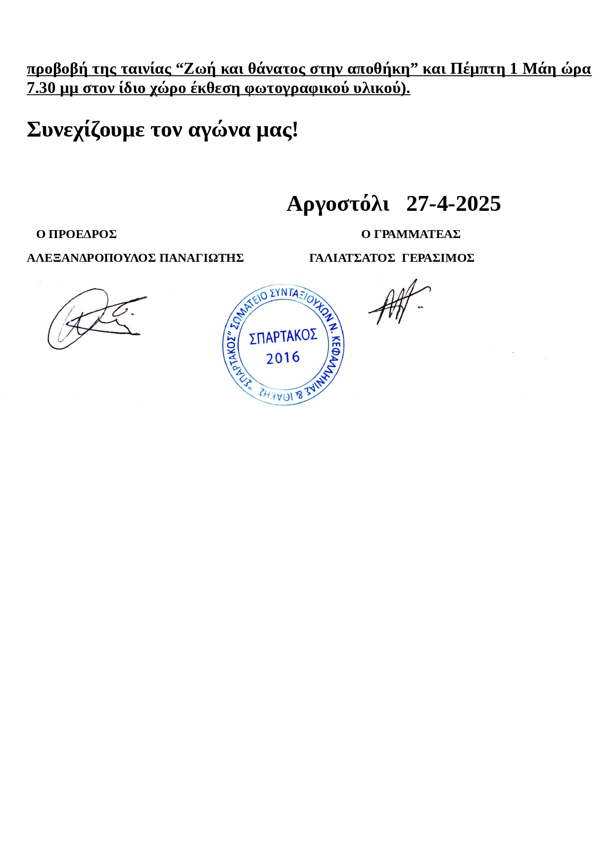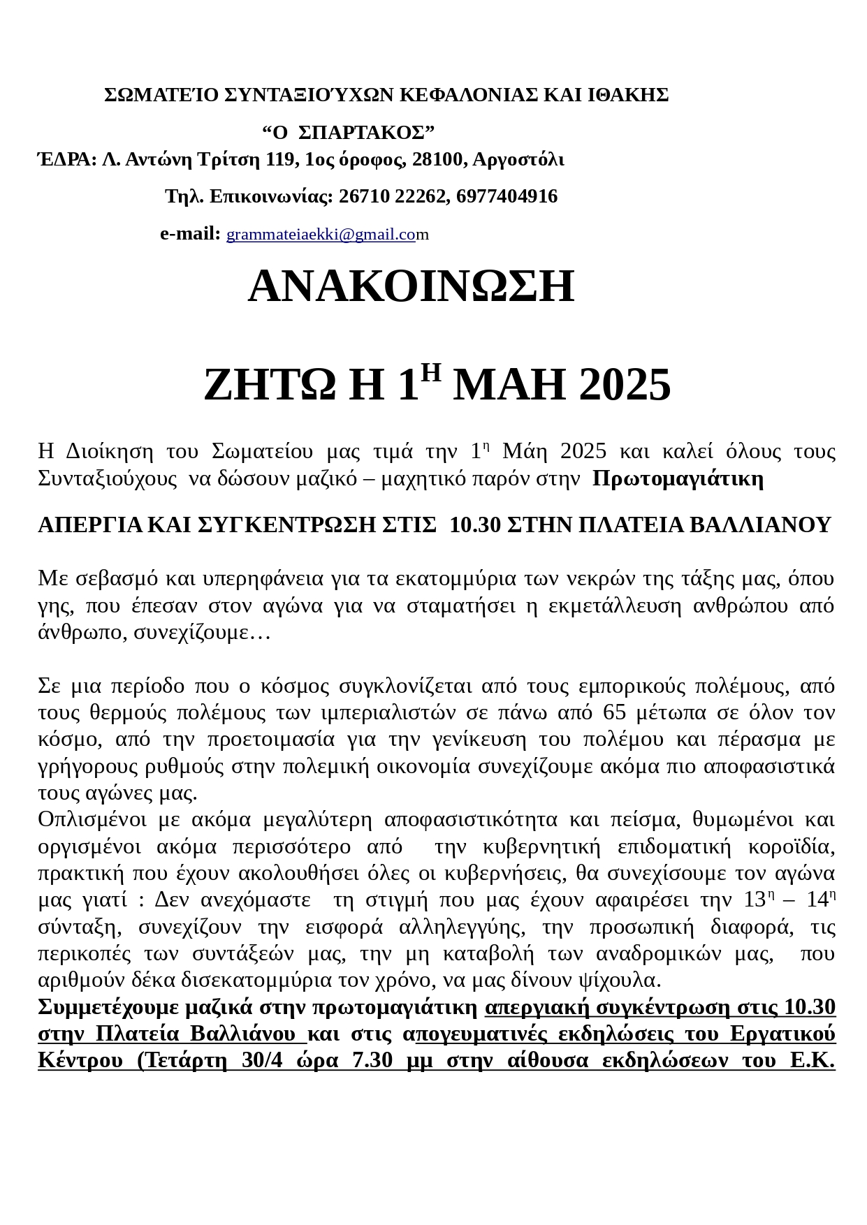Ζήτω η 1η Μάη-Το Σωματείο Συνταξιούχων “Σπάρτακος” συμμετέχει στην Πρωτομαγιάτικη Απεργία