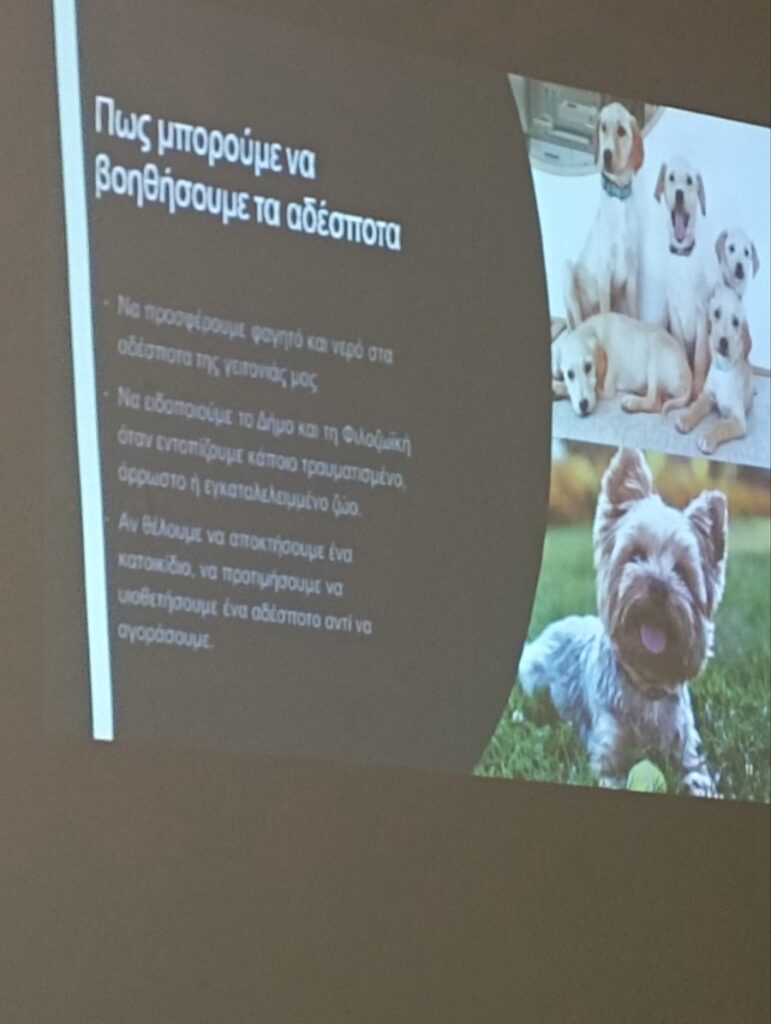 Με ιδιαίτερη προθυμία και ευαισθησία ενημέρωσε μαθητές και τους εκπαιδευτικούς του σχολείου μας για τα δεσποζόμενα και αδέσποτα ζώα. Οι μαθητές έμαθαν τις δυνατότητες παρέμβασης για την προστασία των αδέσποτων και μέσω της διάδρασης ευαισθητοποιήθηκαν. Πληροφορηθήκαμε για το καταφύγιο Ντόρις και τους φιλοζωικούς συλλόγους και το έργο που επιτελούν στο νησί μας. Με τις ερωτήσεις τους οι μαθητές απέδειξαν την αγάπη και το ενδιαφέρον τους για τα ζώα και την καλύτερη διαβίωσή τους .