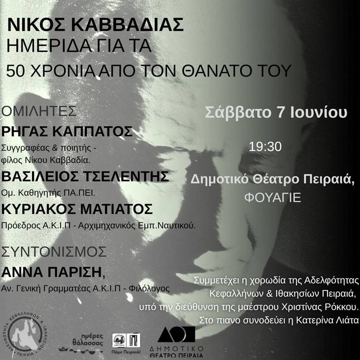 Η Αδελφότητα Κεφαλλήνων & Ιθακησίων Πειραιά σας προσκαλεί Το Σάββατο 7 Ιουνίου στις 19:30 στο Φουαγιέ του Δημοτικού Θεάτρου Πειραιά σε μια ξεχωριστή εκδήλωση-ημερίδα για τα 50 χρόνια από τον θάνατο του Νίκου Καββαδία, ένα αφιέρωμα στον ποιητή των θαλασσών, μέσα από μνήμες, λόγο και μουσική.