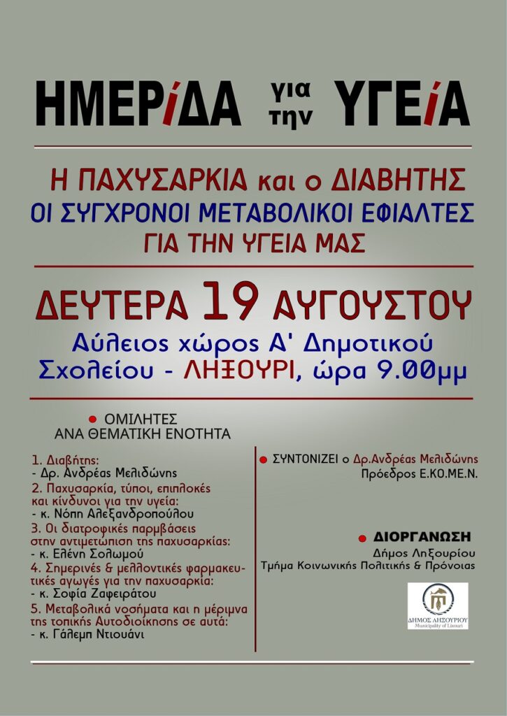 Την Δευτέρα 19 Αυγούστου ο Δήμος Ληξουρίου διοργανώνει μιά εξαιρετικά ενδιαφέρουσα ημερίδα για την Υγεία με θέμα «Η παχυσαρκία και ο Διαβήτης οι σύγχρονοι μεταβολικοί εφιάλτες για την υγεία μας»