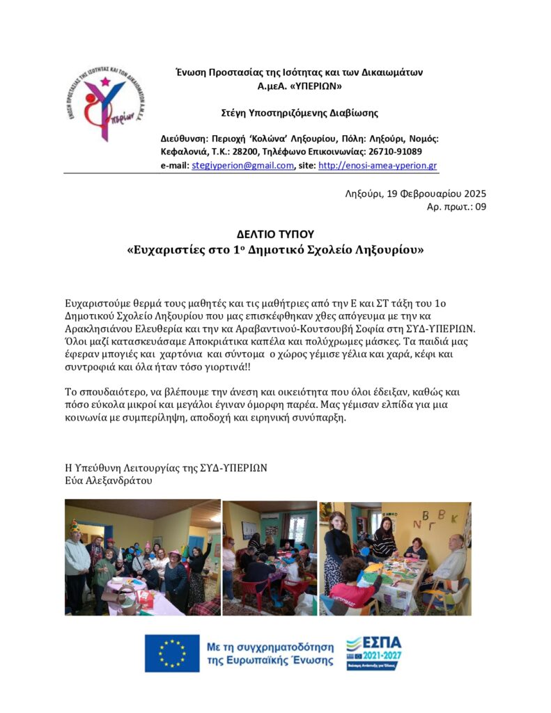 Η Ένωση Υπερίων ευχαριστεί το 1ο Δημοτικό Σχολείο Ληξουρίου