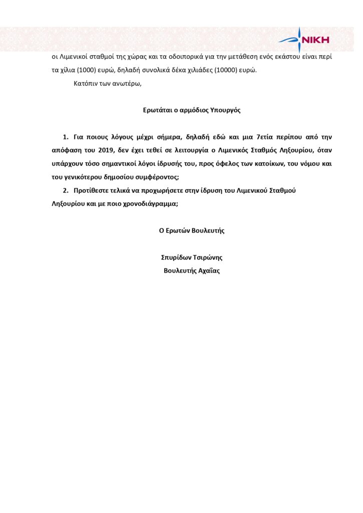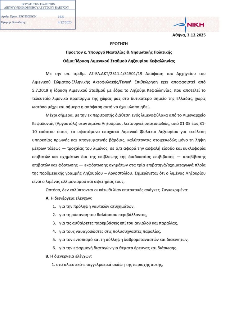 Η ίδρυση Λιμενικού Σταθμού Ληξουρίου στη Βουλή μετά από ανάδειξη του θέματος από την Ένωση Λιμενικών Κεφαλονιάς & Ιθάκης (ΕΠΛΣΚΙ) – Κοινοβουλευτική ερώτηση της ΝΙΚΗΣ