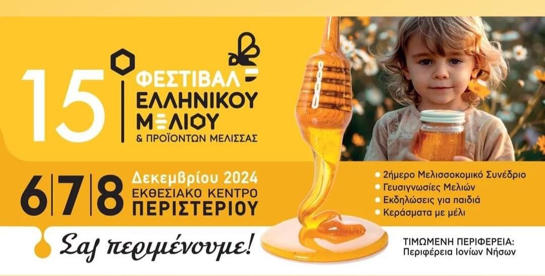 Η Αγροδιατροφική Σύμπραξη Περιφέρειας Ιονίων Νήσων θα λάβει μέρος με αυτόνομο περίπτερο στο 15ο Φεστιβάλ Ελληνικού Μελιού & Προϊόντων Μέλισσας, που διοργανώνεται 6 – 8 Δεκεμβρίου 2024, στο εκθεσιακό κέντρο Περιστερίου, στην Αθήνα! Το Φεστιβάλ τελεί υπό την Αιγίδα του Υπουργείου Αγροτικής Ανάπτυξης και Τροφίμων και αποτελεί τη μεγαλύτερη εκδήλωση του κλάδου μελισσοκομίας στην Ελλάδα.
