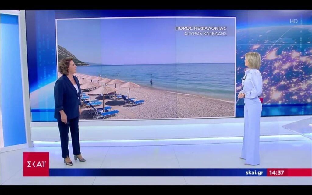 Ευχαριστούμε ολόψυχα την αγαπημένη μας και έγκυρη μετεωρολόγο του ΣΚΑΪ Χριστίνα Σούζη που νωρίτερα σήμερα στο δημοφιλή Μεσημβρινό Δελτίο Ειδήσεων του τηλεοπτικού σταθμού με την υπέροχη παρουσιάστρια Έλλη Κασόλη παρουσίασαν στο πολυπληθές πανελλήνιο κοινό τους φωτογραφία μου από την πανέμορφη και βραβευμένη με “Γαλάζια Σημαία” Παραλία Αράγια του Πόρου της Κεφαλονιάς μας!