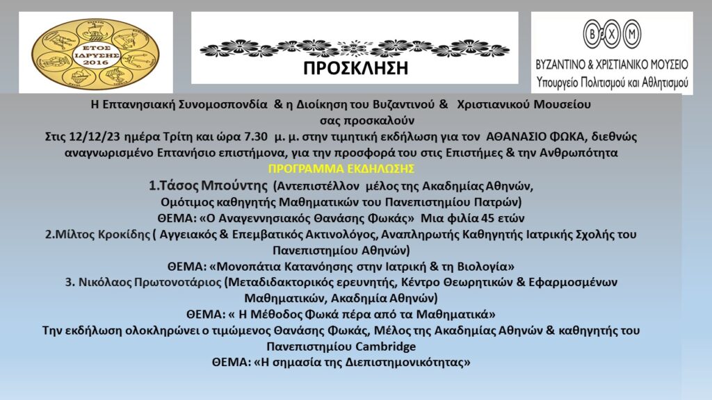 Τιμητική εκδήλωση για τον συμπατριώτη μας Επτανήσιο (Κεφαλλήνα)  κορυφαίο και διακεκριμένο  Επιστήμονα και Ακαδημαϊκό  ΘΑΝΑΣΗ ΦΩΚΑ.